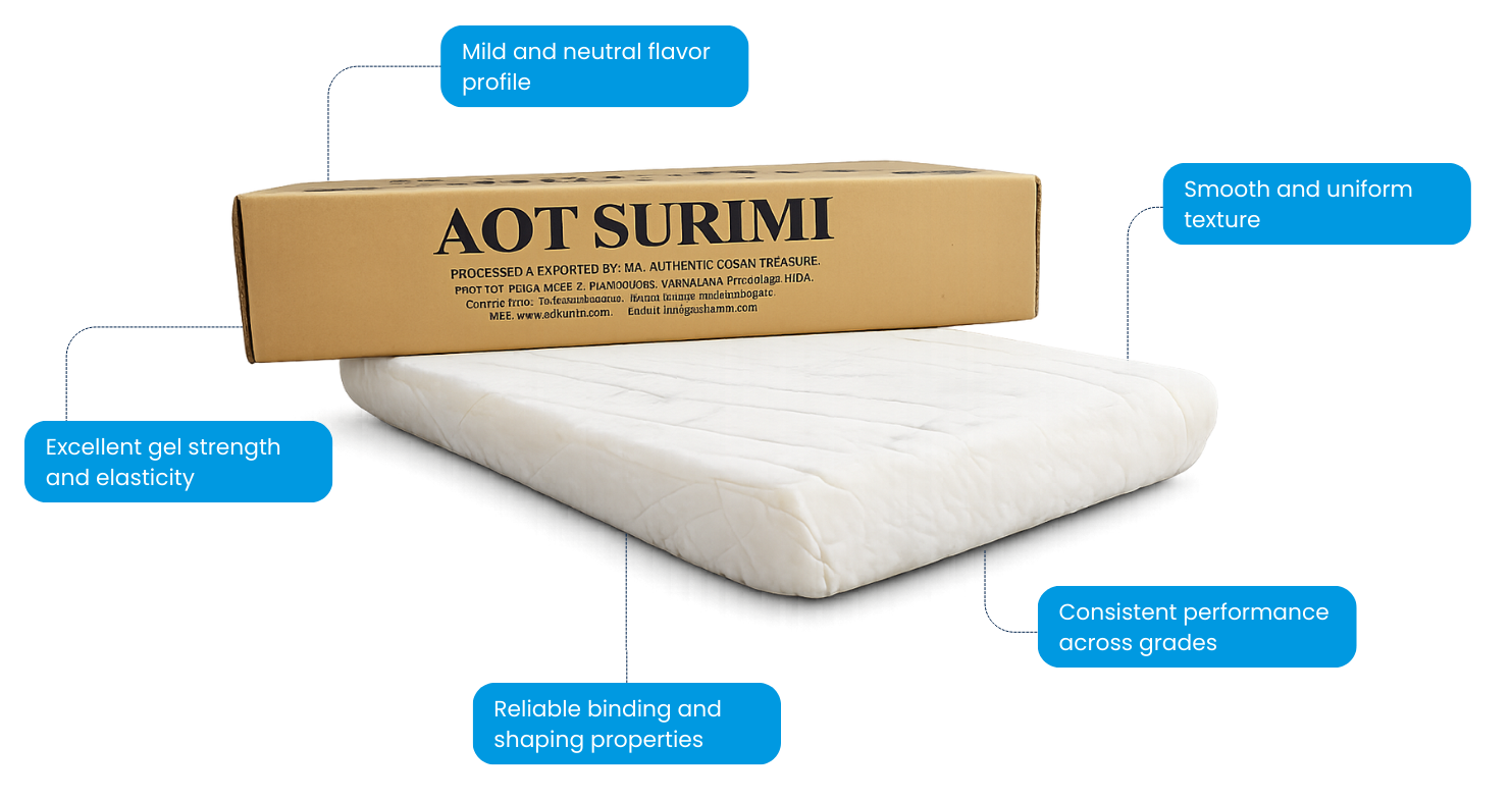 This surimi is valued for its mild, neutral flavor, smooth texture, high whiteness, and excellent gel-forming properties, making it suitable for premium and value-added seafood applications. Its consistent functional performance across batches ensures reliable processing results, positioning Itoyori Surimi as a preferred choice for manufacturers supplying international markets.